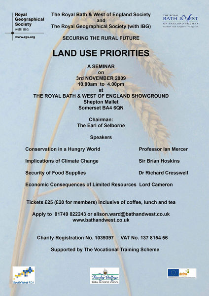 A joint seminar between the Royal Bath and West of England Society and RGS with IBG, "with the aim of examining some of the problems and solutions relating to planning for future sustainable land use in rural areas. Using the West Country as a model, eminent speakers will cover such topics as climate change, population increase, pollution concerns, security of food, energy and economy, biodiversity and scientific developments."